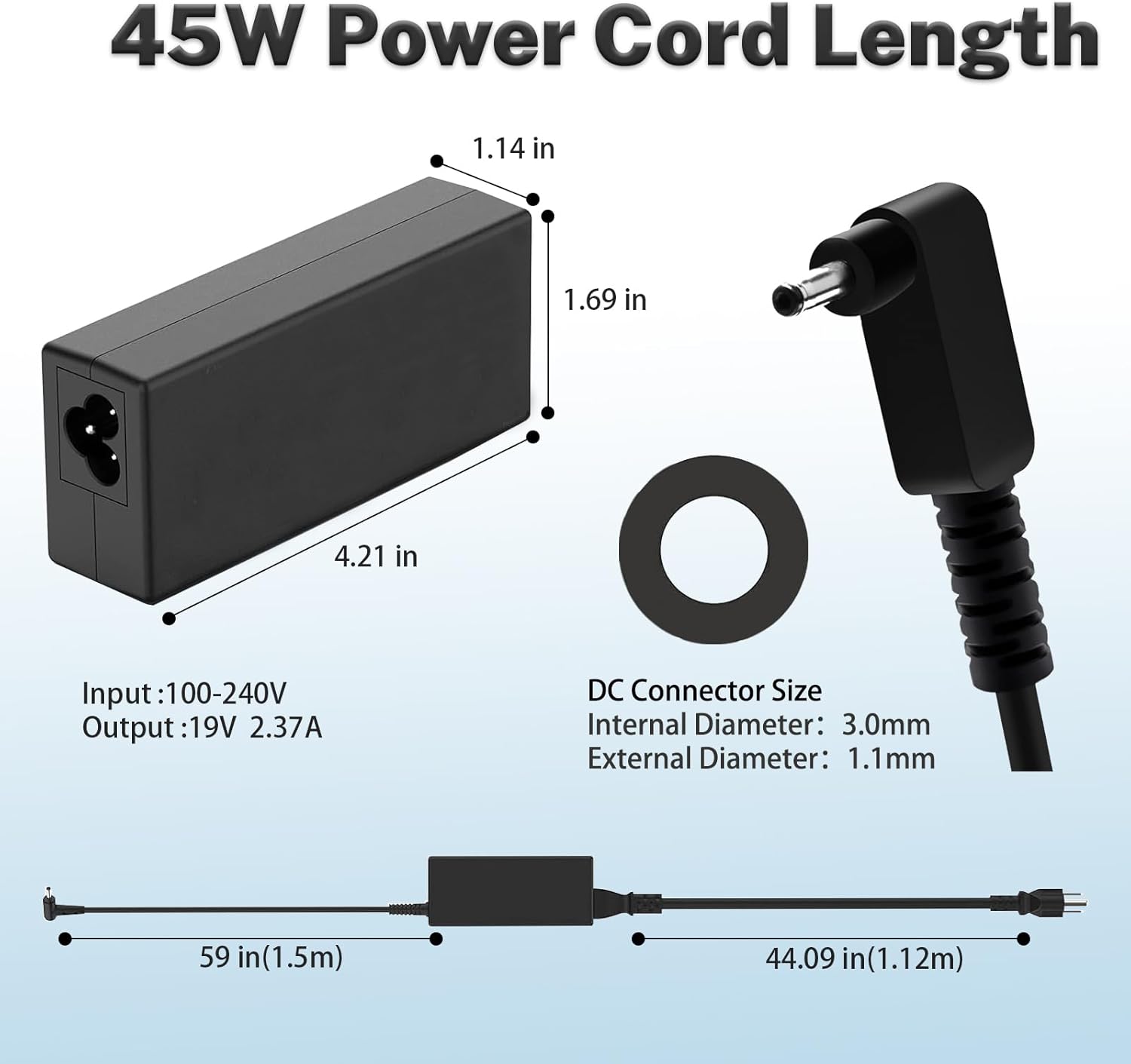 - Output Max: 19V 2.37A 45W / Input Volt Range: 100-240V. Connector: 3.0*1.1mm (Not fit for 5.5×1.7mm!!)