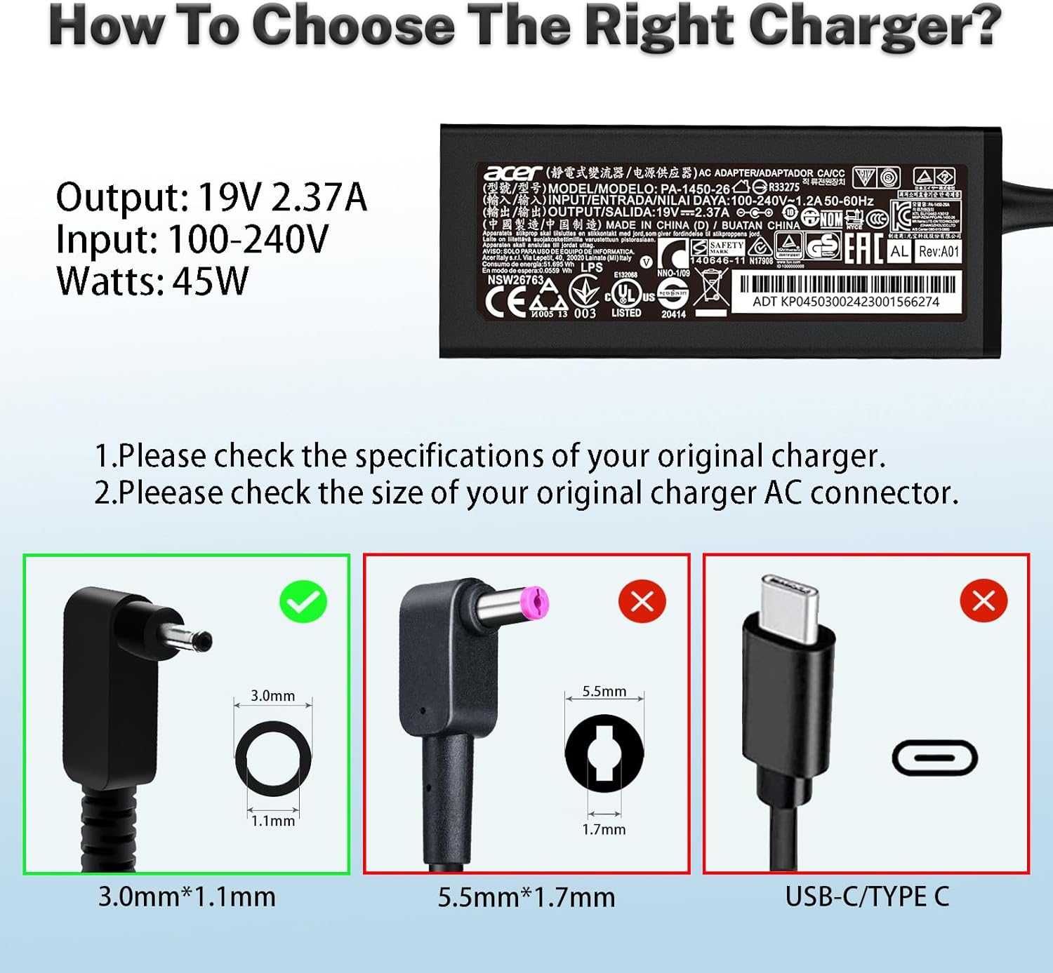 Acer 19V 2.37A 45W Connector: 3.0*1.1mm