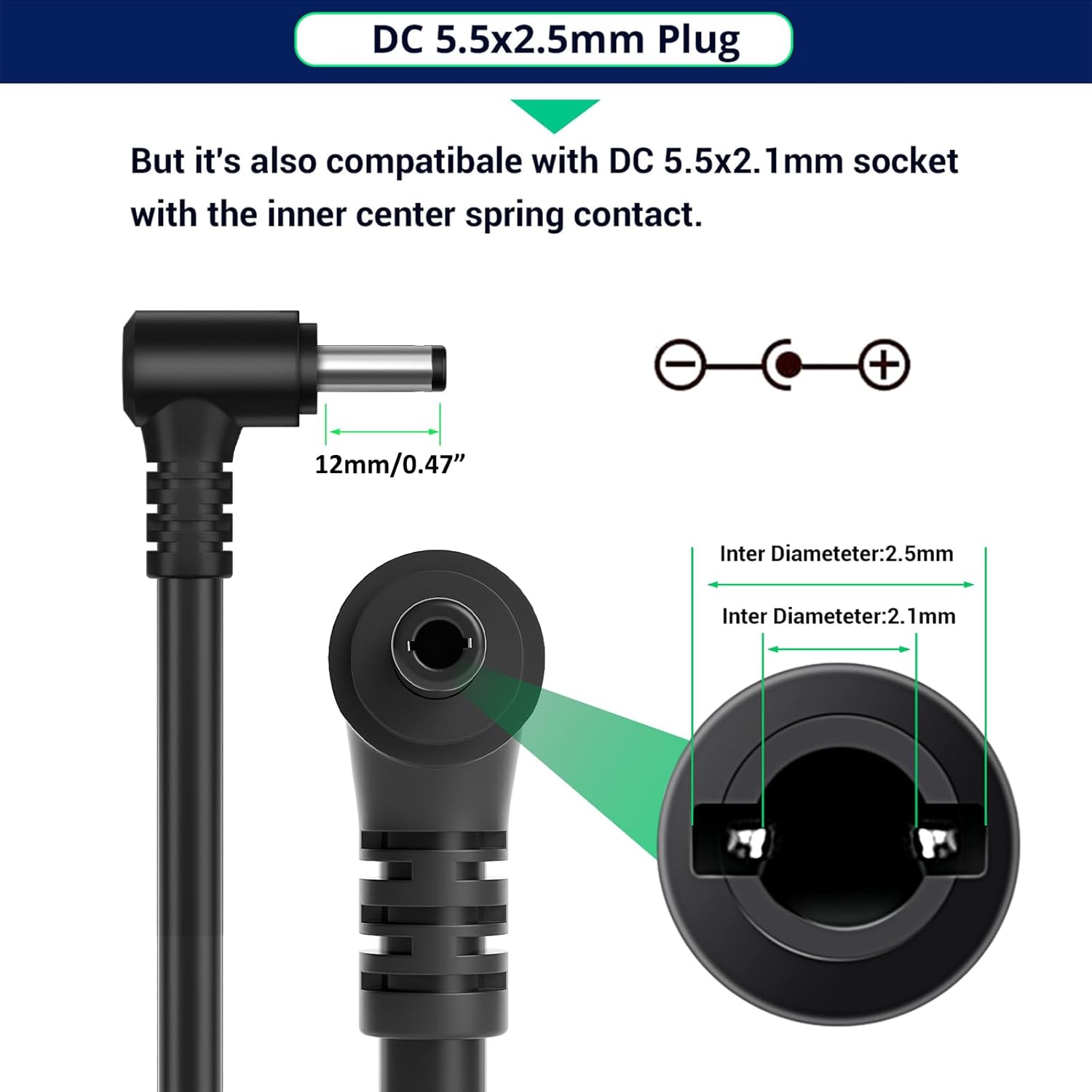 • 【Plug Design】– Fit for both 5.5×2.5mm & 5.5×2.1mm plug. This cable terminates with a “standard” 5.5mm OD, 2.5mm ID DC plug, but it’s also compatible with DC 5.5×2.1mm socket with the inner center spring contact. (NOTE: Power Supply Polarity: Center or Tip is positive (+), Sleeve is negative(-).