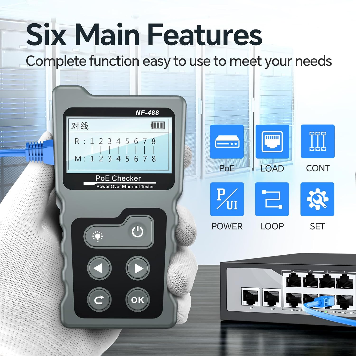 • NF-488 is a multifunctional tester for detecting POE, network cables, and Ethernet. It is mainly used for the installation of weak current systems such as security monitoring, communication lines, and comprehensive cabling, reducing network cable testing and troubleshooting time for people with testing needs.